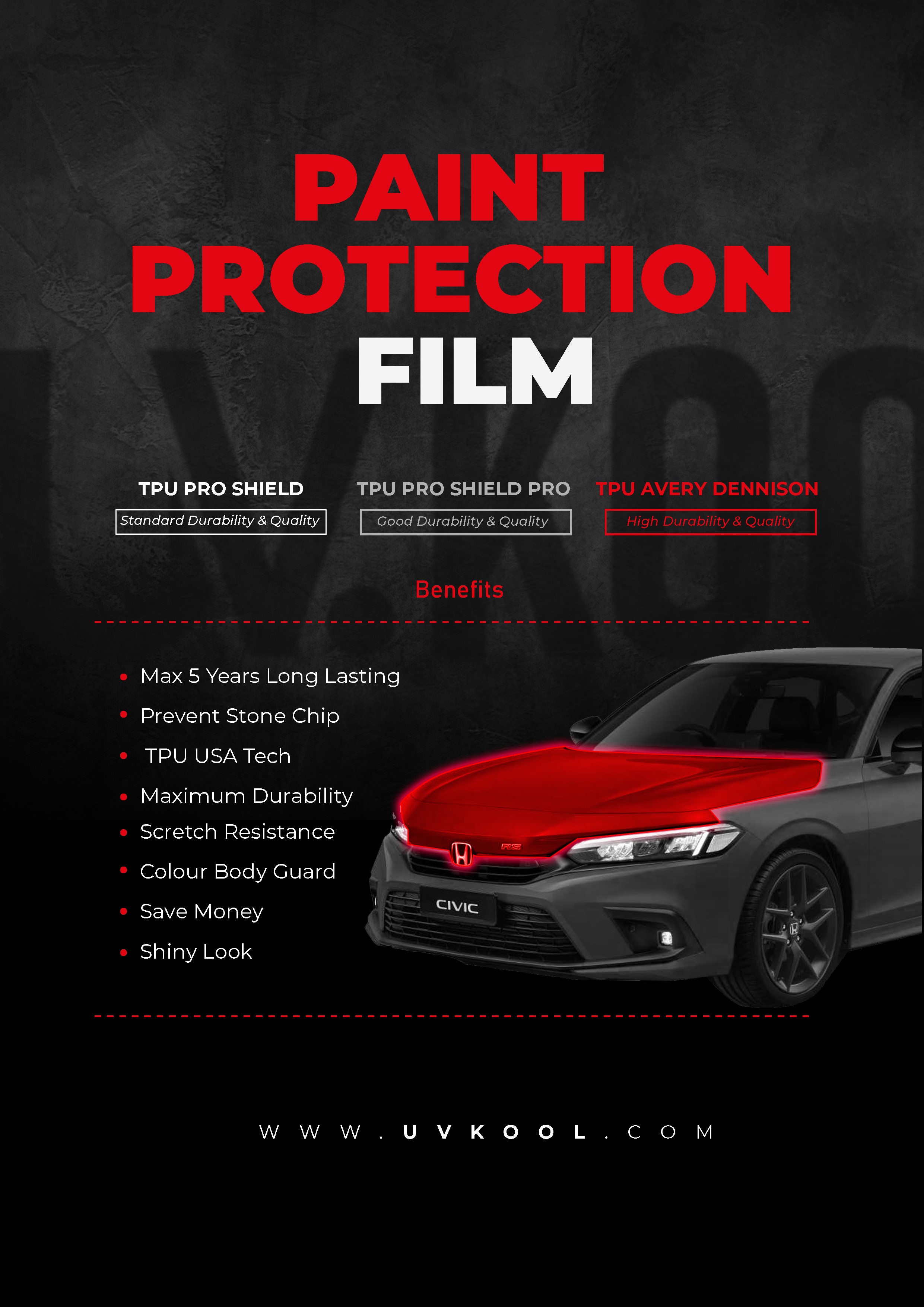 TPU ProShield is an entry-level Thermoplastic Polyurethane (TPU) paint protection film designed to provide essential protection to your vehicle’s paint. This film is known for its flexible and durable nature, offering a balance between cost and performance.